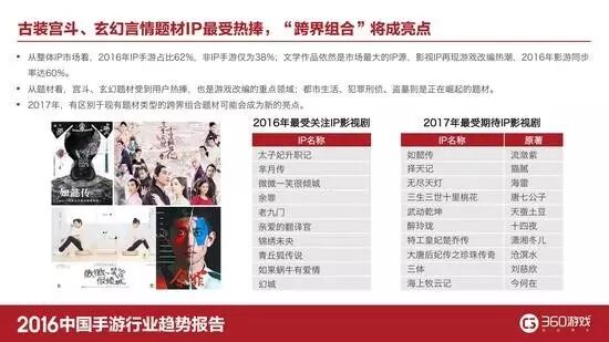 从IP市场看,2016年IP手游占比62%,居于市场主流地位,非IP手游仅为38%。文学作品依然是市场最大的IP源,影视IP再现游戏改编热潮,2016年影游同步率达60%。