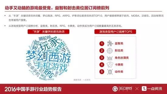 从游戏类型用户订阅榜来看,动手又动脑的手游最受宠爱,益智类、射击类、RPG、卡牌类、动作类成为用户订阅数量最高的五类游戏。