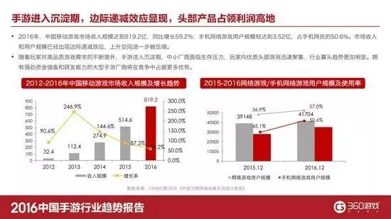 2016年,中国手游市场进入存量时代,虽然收入规模达到819.2亿,同比增长59.2%,用户规模达到3.52亿,但边际递减效应也正在发生。预计2017年,中国手游市场整体收入规模有望突破1000亿元,但实际增长率将继续放缓。