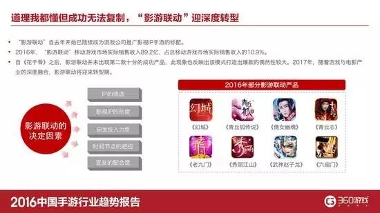 产品方面,《幻城》手游与电视剧进行联动、《倩女幽魂》深度植入《微微一笑很倾城》,成为去年影游联动的代表案例。如今,“影游联动”正在进入一个更加成熟的深度转型期,游戏和影视将在产业层面实现深度融合,厂商之间通过不断磨合优化,将进一步推动影游联动模式的全面升级。