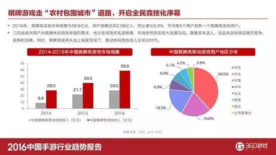 2016年,棋牌类游戏市场规模达到58.6亿元,用户规模达到2.58亿人,同比增长5.9%,平均每5个用户就有一个棋牌类游戏用户。三四线城市用户对棋牌游戏,特别是地方性棋牌具有强烈需求,市场依然存在较大发展空间。但随着棋牌游戏体量进一步增大,其敏感的属性也使得广电部门的监管审核正在趋紧,同时随着资本进入,该品类游戏将迎来更为激烈竞争和洗牌。