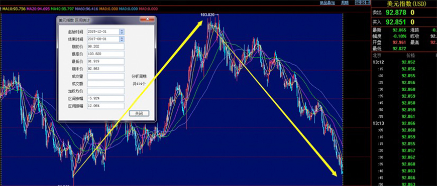 第二个向下的黄色箭头阶段:步入了2017年,在特朗普成功竞选美国总统、美联储加息与中国加强资本项目管制等综合作用下,美元指数一头向下,犹如失控一般,不断加速下跌。截至2017年8月1日,美元指数跌至92.78。