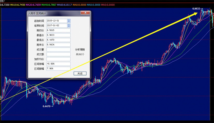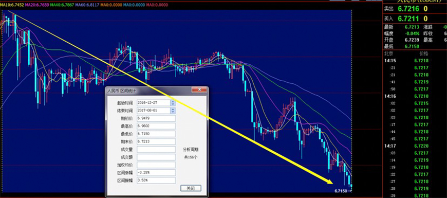 没有错,实际的真实走势是,2017年上半年,人民币兑美元强势升值。从2016年12月份最低时,一美元兑换6.9633人民币,截至2017年8月1日,涨至一美元兑换6.715人民币。