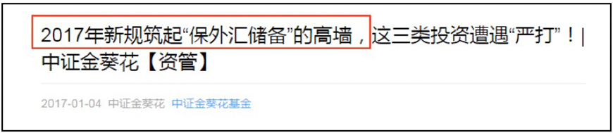 2017年1月4日,笔者怀着极度欣喜的心情写了一篇文章“2017年新规筑起“保外汇储备”的高墙,这三类投资遭严打”,分析外汇管理局新规的影响,文章发送在公司微信公众号上。