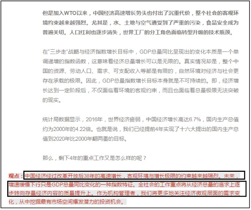 我们认为:中国经济经过改革开放后38年的高速增长,客观环境与增长极限的约束越来越强烈。未来,增速缓慢下行只是GDP总量同比变化的一种指数特征。全社会的工作重点将从经济总量的追求上逐步转向存量经济内容的质量提升上。