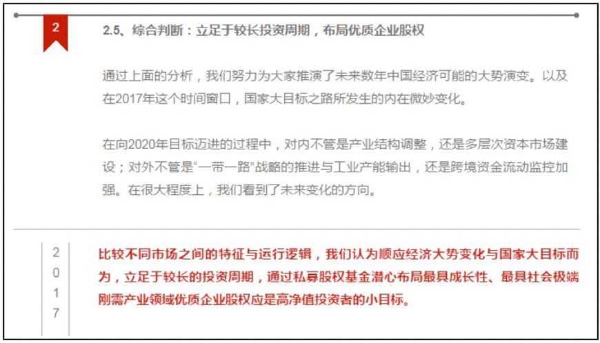 最后,我们这样建议:立足于较长的投资周期,通过私募股权基金潜心布局最具成长性、最具社会极端刚需产业领域优质企业股权应是高净值投资者的小目标。