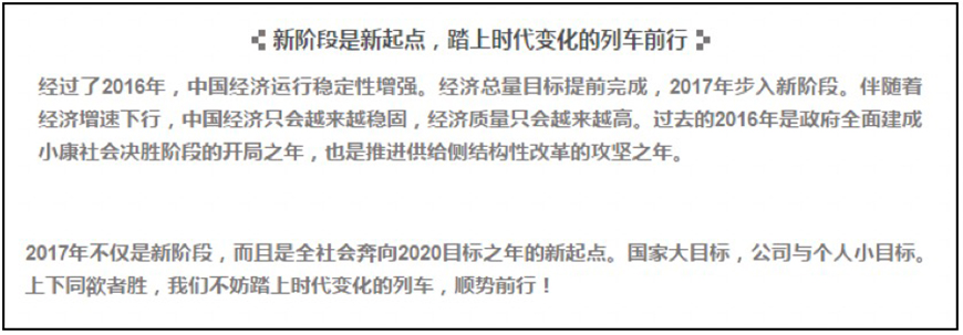 2017年初,我们建议:新阶段是新起点,踏上时代变化的列车前行。2017年不仅是新阶段,而且是全社会奔向2020目标之年的新起点。国家大目标,公司与个人小目标。上下同欲者胜,我们不妨踏上时代变化的列车,顺势前行!