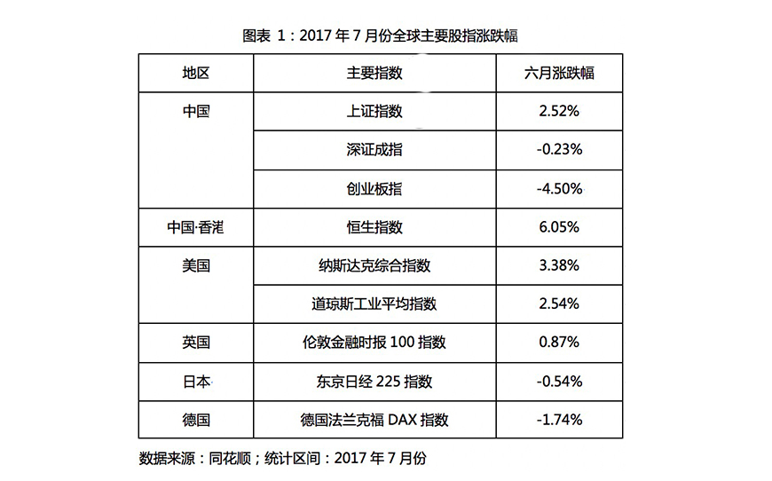 7月份,上证随着银行、钢铁等板块的推动,延续六月末的快速上证行情,深证指数、创业板指数在历经全国金融会议冲击后进入修复行情。截止7月31日,上证指数上涨2.52%,报收3273.03点;深成指数下跌0.23%,报收10505.04点;创业板指数下跌4.50%,报收1736.307点。板块方面,高送转、次新股、有色、军工、钢铁等板块涨幅靠前。