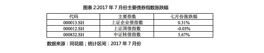 分析:2017年上半年中国宏观经济表现强劲,上半年GDP同比增长6.9%,居民消费价格同比上涨1.4%,涨势温和。7月份,制造业PMI指数为51.4,环比下跌0.3个百分点,下跌原因主要受7月高温,部分地区遭受暴雨洪涝灾害影响生产开工。总体而言,制造业市场状况良好,海外需求强劲,延续稳中向好的发展态势。资金价格经历月初的回调后再次上涨,国债7月份小幅回落。当前债市杠杆率整体已经处于低位,企业信用风险下降,企业债延续上涨行情。A股市场7月份三大指数在全国金融会议后全体震荡向上,资金活跃度提升,利好可转债整体上涨5.67%。