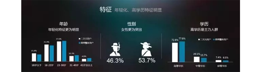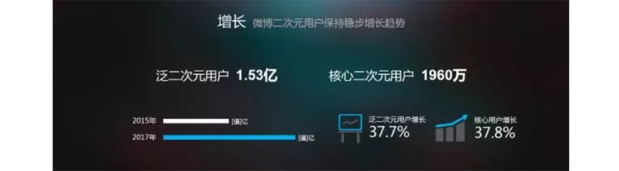 据艾瑞咨询分析,2016年国内核心二次元用户规模达7000万人,泛二次元用户规模达2亿人。“二次元”总人数接近2.5亿人。数据 显示,仅在新浪微博上的核心二次元用户就有1960万人,泛二次元用户达到了1.53亿人。“二次元”正随着年轻一代的成长逐渐成为“三次元”世界里必不可少的文化因素。