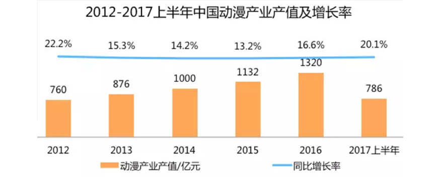 数据显示, 2016年,中国动漫产业产值达到1320亿元,同比增长16.6%。而截止到2017上半年,中国动漫产业产值达到786亿元,同比增长20.1%。预计到2017年底,中国动漫产值将达到1500亿元,预计较上年同比增长13.6%。