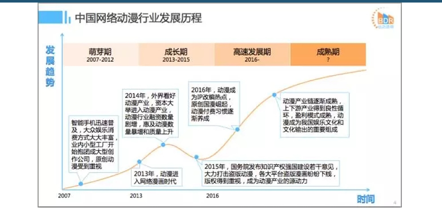 从2013年开始,国内动漫产业与互联网并行快速发展,增长的速度是有目共睹的。2013年,网络漫画开始成长;2014年,大量资本开始注入动漫产业,融资案例剧增。2015年,动漫版权进一步得到相关政策的保护,重视度也大大提高,为动漫产业的发展提供了保证。2016年,以IP改编作为重要发展方向的动漫产业带动了原创国漫的崛起,这个时候的动漫付费习惯也逐渐养成。