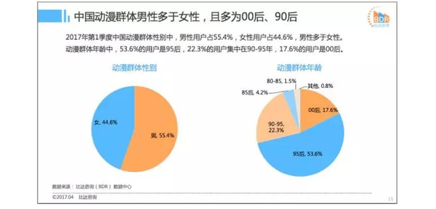 近几年女性在动漫产业领域中的消费比例出现明显的增幅,国内也出现了女性动漫的细分领域。在这群体中,95后的在校大学生占据了53.6%的高比例,这群用户中大多是单身或者“宅生活”为主的人群。