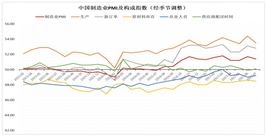 2017年7月份,中国制造业采购经理指数(PMI)为51.4%,比上月小幅回落0.3个百分点,与上半年均值基本持平,制造业总体走势平稳。