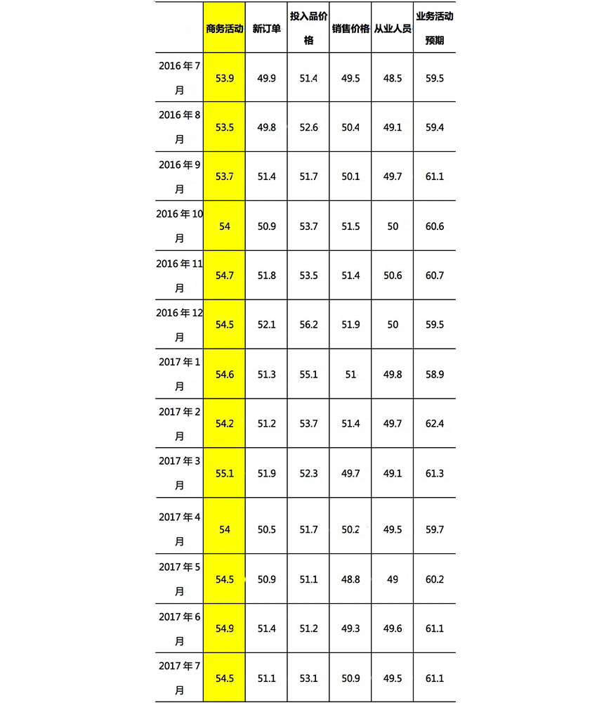 2017年7月份,中国非制造业商务活动指数为54.5%,虽比上月回落0.4个百分点,但与上半年均值基本持平,非制造业继续保持稳中向好的发展势头。