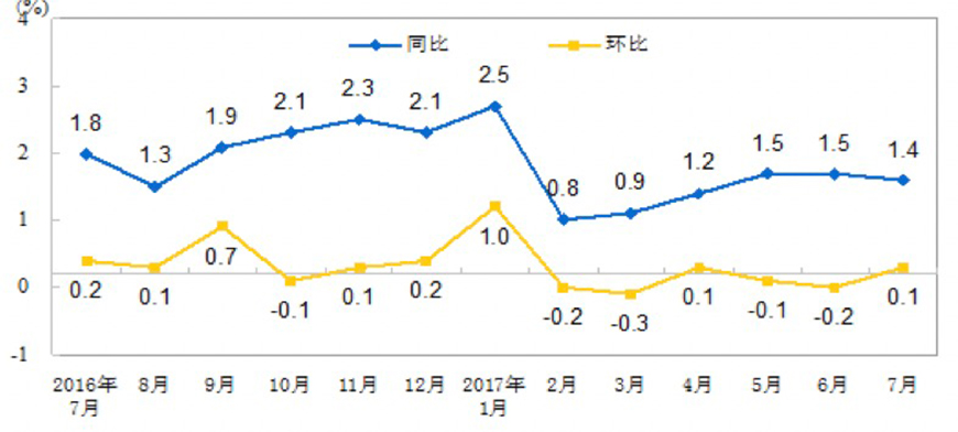 2017年7月份,全国CPI同比上涨1.4%。其中,城市上涨1.5%,农村上涨1.0%;食品价格下降1.1%,非食品价格上涨2.0%;消费品价格上涨0.5%,服务价格上涨2.9%。