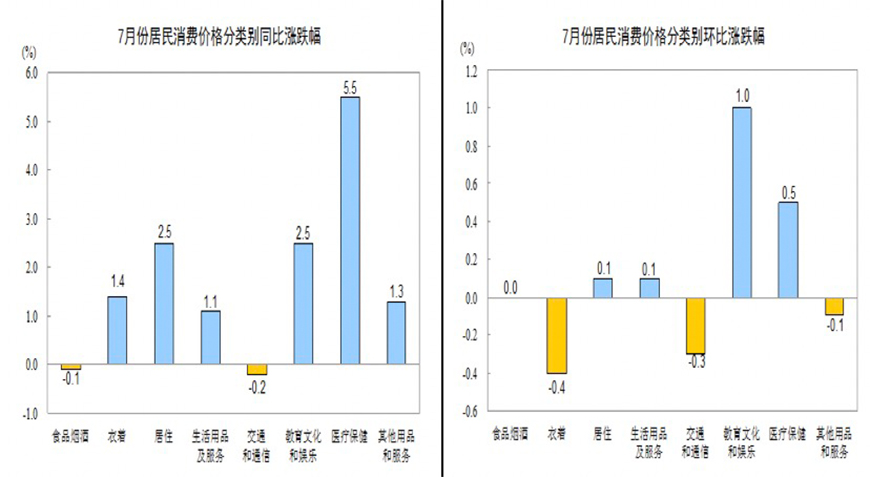 各类商品及服务价格同比变动方面:7月份,食品烟酒价格同比下降0.1%,影响CPI下降约0.04个百分点。其他七大类价格同比六涨一降。