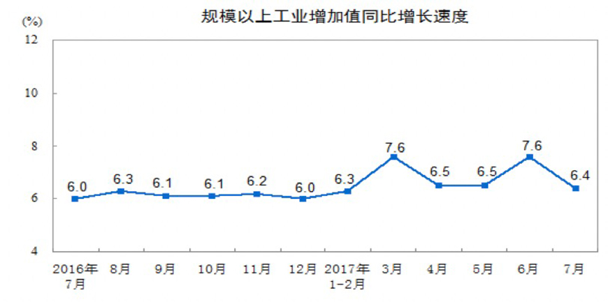 2017年7月份,规模以上工业增加值同比实际增长6.4%,比6月份回落1.2个百分点,比上年同月加快0.4个百分点。从环比看,7月份,规模以上工业增加值比上月增长0.41%。1-7月份,规模以上工业增加值同比增长6.8%。