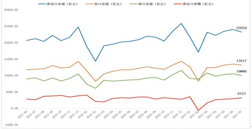 分析:7月进出口同比快速增长,环比增速出现回落,但是进出口顺差进一步扩大,说明对外贸易保持稳定格局。一般贸易比重的提升,反映了贸易结构的逐步优化改善。在美国贸易保护主义再次抬头的范围中,我国对外进出口贸易继续快速增长,贸易顺差持续扩大,背后根本原因是,我国作为全球消费产品生产基地的不可替代性决定的。预计8月,进出口将继续保持稳定。