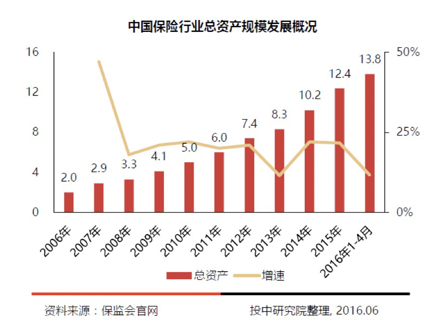 作为资本市场的重要组成部分,近十年,得益于中国宏观经济的快速发展以及保险业制度的一系列创新,中国保险业获得快速地发展。根据保监会披露的《2016年1-4月保险统计数据报告》,截至2016年4月末,保险公司总资产13.80万亿元,较年初增11.65%。其中,产险公司总资产2.09万亿元,寿险公司总资产11.39万亿元,再保险公司总资产0.32万亿元,资产管理公司总资产0.04万亿元。