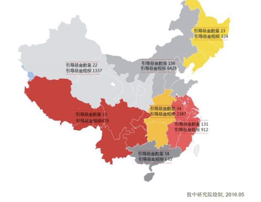 从国内成立的引导基金分布来看,华北地区累计成立156支引导基金,目标设立规模高达到6425.4亿元,无论是数量还是目标规模,华北地区均跃居各地区之首;其次,华东地区和华南地区引导基金的设立也较为积极活跃,基金数量分别为131支和58支,基金规模分别为911.5亿元和943.4亿元;另外值得一提的是华中地区和西北地区,两个地区整体的基金数量并不多,但地区基金规模均过千亿元,这主要依赖于地区内单支大规模引导基金的成立,如华中地区2000亿规模的湖北长江经济带产业基金的成立和西北地区1000亿规模的新疆维吾尔自治区PPP政府引导基金的成立。
