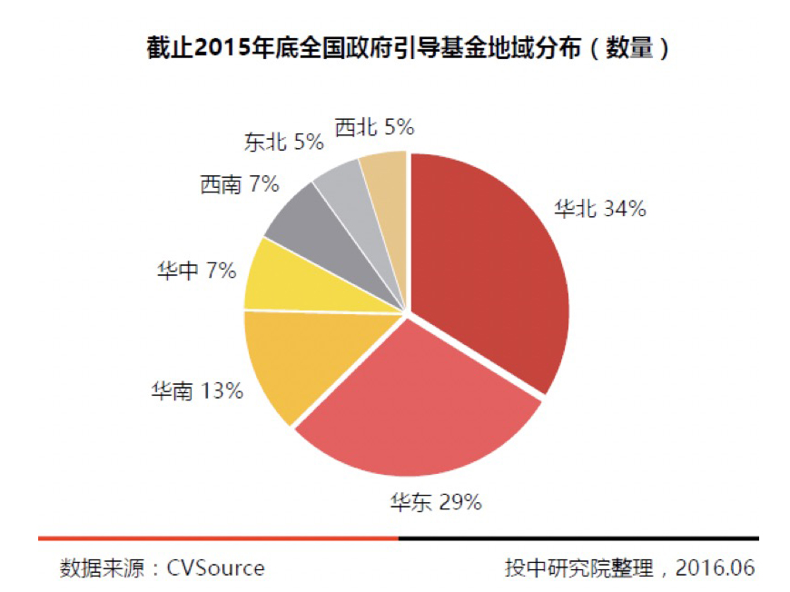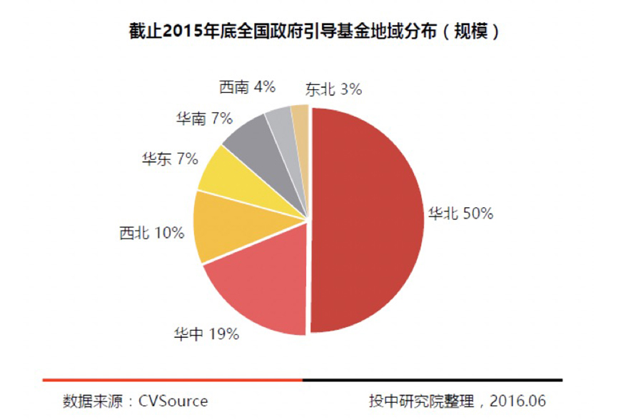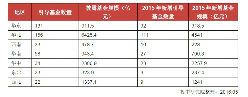 从政府引导基金的设立情况来看,各地区都在如火如荼地设立引导基金。2015年新增引导基金数量最多的为华北地区,这一井喷式的爆发也使华北地区超越华东成为引导基金设立最多的地区;而作为引导基金设立最为密集的华东地区放缓了设立的脚步,虽然华东地区在2015年新增引导基金数量共计32支,位列本年新增引导基金数量第二名,但其增速相比于其他地区已大幅下降,仅为32.2%;作为政府引导基金起步较晚的中西部地区,近一年来也发展迅猛,不断出现较大规模的引导基金,希望撬动更多的社会资本涌入当地,带动本地区的经济发展。