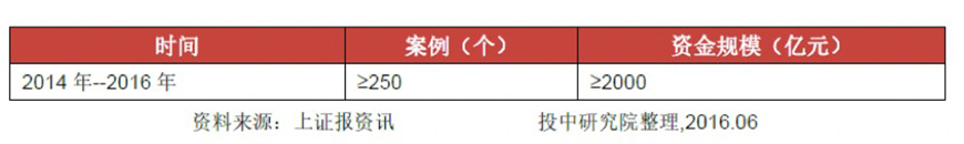 据投中研究院统计,上市公司+PE这种模式创立于在2011年硅谷天堂与大康牧业的合作中。此后,这种新兴模式被越来越多的机构所模仿,并在2014年与2015年达到了高潮与井喷。从2014年至今,通过“上市公司+PE”模式设立的基金案例超过了250个,基金总规模达2000亿元。