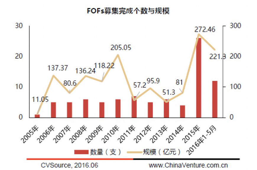 而从具体数据来看,我国FOFs的成立数量与募资规模大体呈逐年增长趋势,尤其是在2015年和2016年1-5月,成立数量与募资规模均为之前几年的数倍。