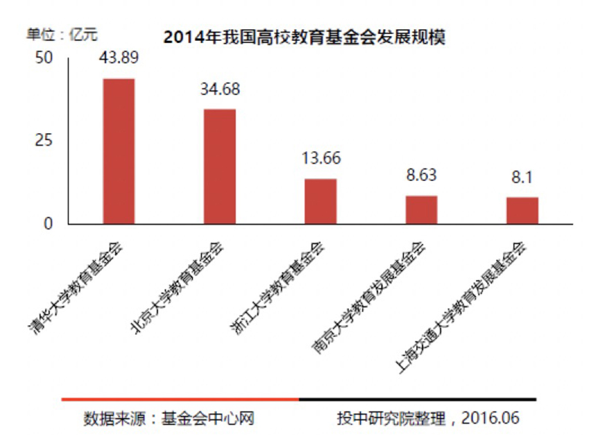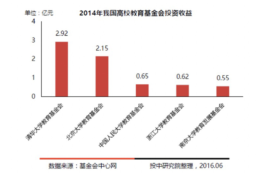 相比欧美国家,我国高校教育基金的发展起步比较晚,1990年左右开始进入迅速成长期。2004年国务院颁布实施的《基金会管理条例》作出了指导、规定。条例称基金会应当按照合法、安全及有效的原则实现经济的保值、增值。目前我国部分高效已经尝试股票、证券、国债以及股权投资等。从发展规模来看,2014年清华大学、北京大学以及浙江大学教育基金会分别以43.89亿元、34.68亿元以及13.66亿元名列前三;从投资收益来看,清华大学、北京大学和中国人民大学教育基金会分别以2.92亿元、2.15亿元和0.65亿元名列前三。