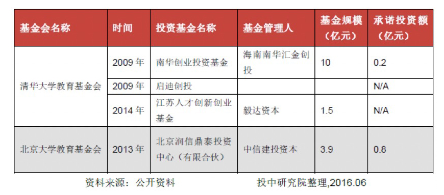 目前,我国已有高校教育基金会在尝试投资VC/PE。如清华大学教育基金会向南华创业投资基金投资2000万元。2009年11月,启迪创投与清华大学教育基金会签约,成为国内首家获得大学捐赠基金注资的创投机构,启迪创投也顺势成为首个国内大学基金会控股的创投。