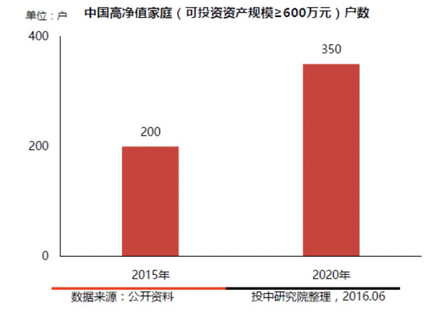 根据BCG出版的《2020中国资产管理模型》,高净值个人仍是中坚力量。从发展机遇来看,2015年中国高净值家庭(可投资资产规模在人民币600万元以上)户数为200万左右,2020年预计将上升至350万户。这类客户通常为企业主、职业经理人、专业投资人以及文体明星等,特点为单位财富高,投资经验较丰富,投资行为与机构投资者趋同。