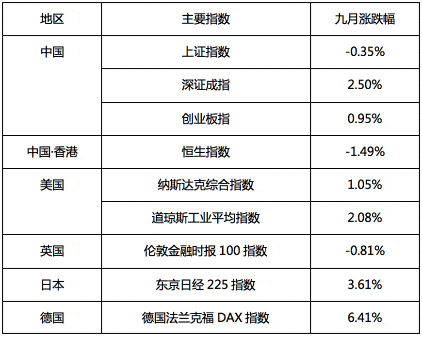 9月份,A股延续窄幅震荡整理的格局,成交量持续低迷,节前投资者情绪愈加谨慎,但市场并未出现明显的抛压迹象,投资者对于后市或仍持偏乐观的态度。截止9月29日,上证指数下跌0.35%,报收3348.94点;深证指数上涨2.50%,报收11087.19点;创业板指数上涨0.95%,报收1866.98点。板块方面,5G通信、汽车整车、充电桩、芯片替代等概念板块涨幅靠前。