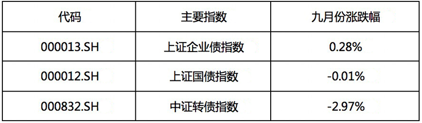 中国宏观经济稳中向好,企业杠杆率整体回落,A股市场9月呈现震荡横盘行情,截止9月29日,上证企债指数上涨0.28%,上证国债指数下跌0.01%,中证转债指数下跌2.97%。
