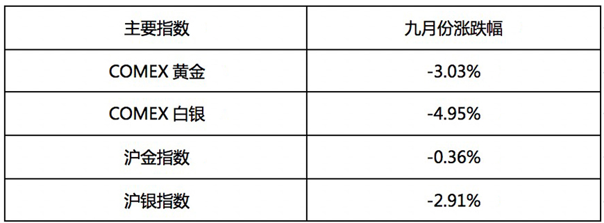 9月份,美朝紧张局势没有解除,美国非农数据出现负增长,美联储将如约在10月启动缩表,贵金属市场受波及一路走低,截止9月29日,美黄金下跌3.03%,美白银下跌4.95%;沪金下跌0.36%、沪银下跌2.91%。