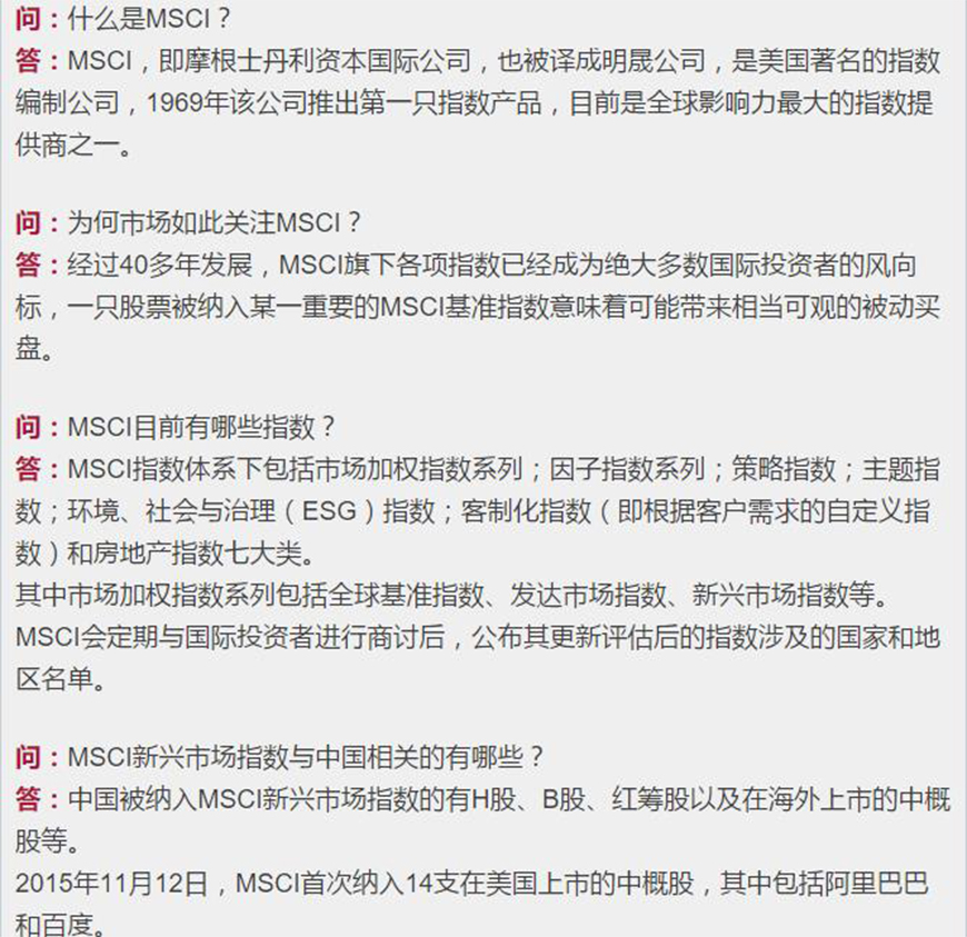 2018年6月1日,按照2.5%的纳入比例将A股正式纳入“MSCI新兴市场指数”中。2018年9月3日,将A股的纳入比例提高到5%。