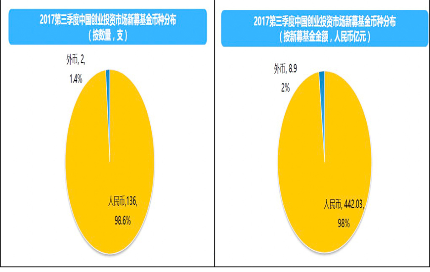 从基金币种看,2017第三季度中外创业投资机构以人民币基金为主,138支新募集基金中有136支基金是人民币基金,共新募集442.03亿元人民币。