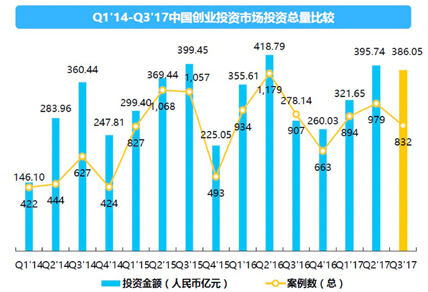 数据显示,2017第三季度中国创业投资市场共发生832起投资案例,披露投资金额的796起投资交易共涉及386.05亿元人民币。