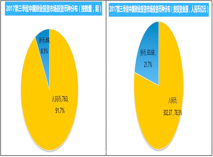 从投资币种看,2017第三季度中外创业投资机构以人民币投资为主,人民币投资有763起,共涉及投资金额302.37亿元人民币。