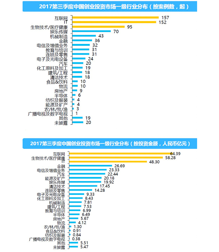 人工智能和基因测序概念在三季度持续受到VC资金的追捧。从投资案例数和投资金额综合来看,互联网,IT与生物医疗保健是创投资金最青睐的行业。