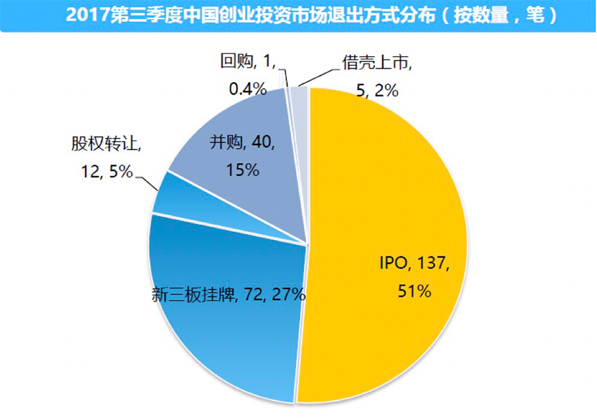 清科数据显示,2017年第三季度,中国创业投资市场共发生267笔退出案例,环比上升1.1%。第三季度国内创业投资机构IPO退出发生137笔,是去年同期的1.9倍多,平均账面回报倍数(按2上市后20交易日计算)将超9倍,退出渠道明显改善。