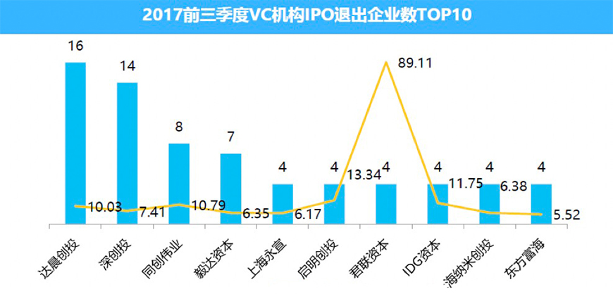 据私募通统计,2017前三季度VC机构IPO退出企业数最多的是达晨创投,高达16家,回报倍数超过10倍;深创投紧随其后,企业IPO14家,但回报倍数是7.41倍;君联资本也业绩不俗,虽然IPO退出案例数仅有4家,但账面回报倍数高达89.11,在行业内遥遥领先。