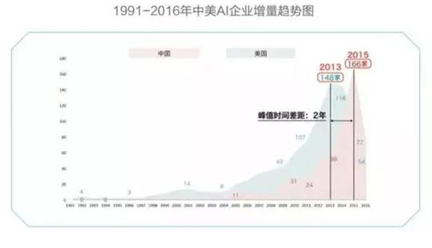 和美国相比,中国的AI产业进步略晚,1996年开始起步,2003年进入发展时期,2008年--2015年期间进入高速成长时期,到2015年期间,人工智能有关的企业达到166家。