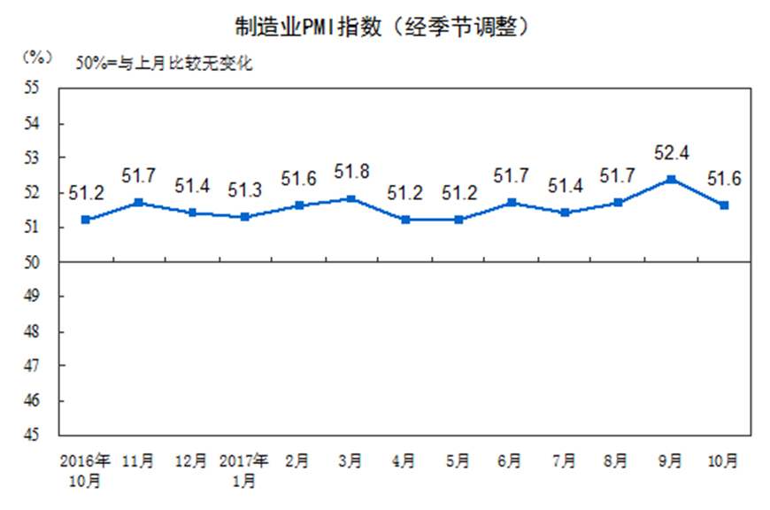 2017年10月份,中国制造业采购经理指数(PMI)为51.6%,比上月回落0.8个百分点,达到今年均值水平,制造业延续扩张的发展态势。