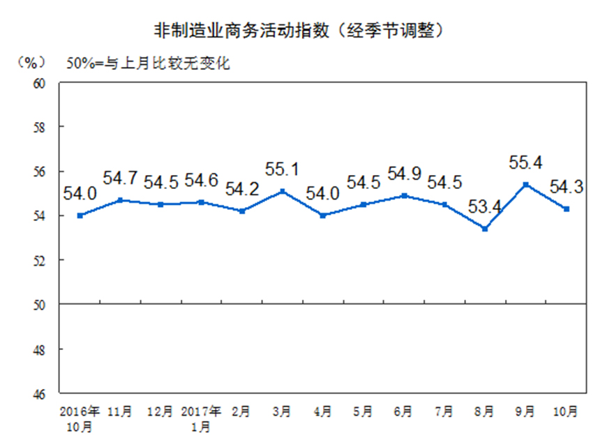 二、服务业保持稳定增长,10月中国非制造业商务活动指数为54.3%