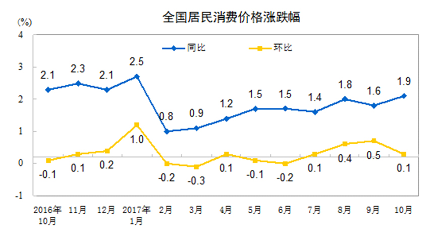 数据显示,10月份,全国CPI同比上涨1.9%。其中,城市上涨1.9%,农村上涨1.7%;食品价格下降0.4%,非食品价格上涨2.4%;消费品价格上涨1.1%,服务价格上涨3.2%。1-10月平均,全国CPI比去年同期上涨1.5%。
