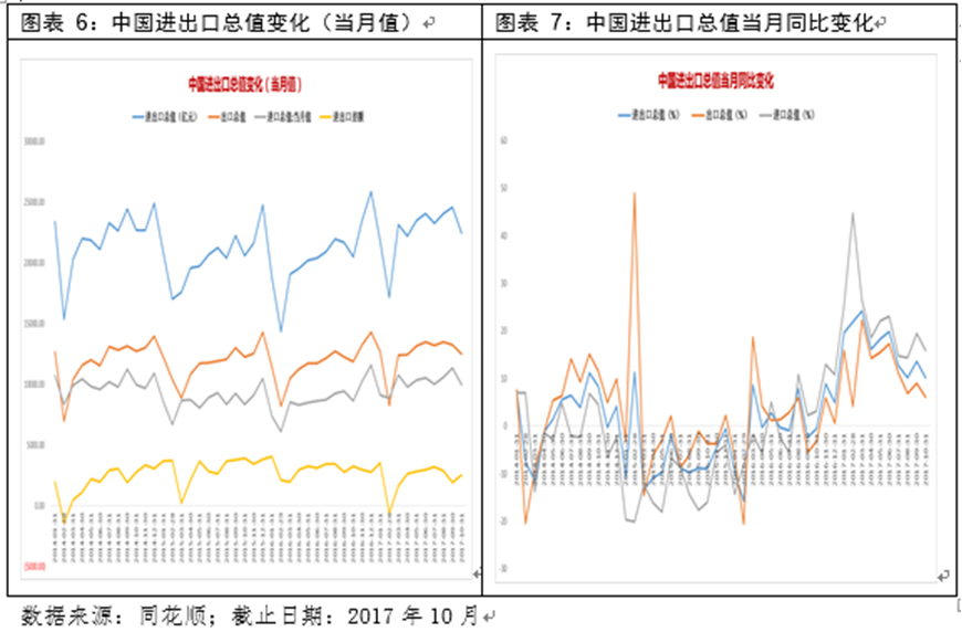 分析:10月份,中国进出口总值、进口与出口,均出现同比下降。背后核心原因是,2016年,中国进出口呈现前低后高的态势,四季度四季度进出口由前三季度的下降2.6%转为增长3.8%,而今年以来逐季回升,受此影响,第四季度进出口增速高位趋缓。
