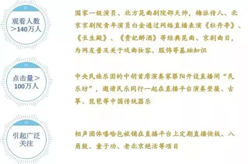 网络直播门槛低、易操作、受众广的特点也吸引了越来越多的传统艺术,许多传统艺术家成为“网红”,其精湛的才艺备受网民追捧。例如: