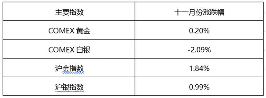 11月初美联储议息会议过后,美元指数表现疲软,整体处于回调状态,贵金属普遍出现反弹行情。美金、美银11月走出宽幅震荡行情,成交量放大,月末出现快速调整。截止11月30日,美黄金上涨0.20%,美白银下跌2.09%;沪金上涨1.84%、沪银上涨0.99%。