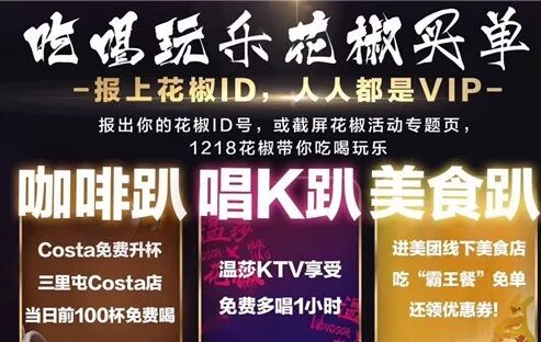 这次1218直播节线上有眼福,线下更是福利多多。豪华明星阵容,上卫视直播的年终盛典。12月18日当天,手持花椒ID或截屏花椒活动专题页,无论咖啡趴、唱K趴还是美食趴,花椒统统为你买单!在线上,花椒在站内推出充值返现等一系列活动。
