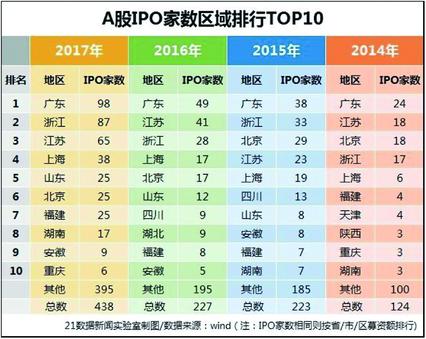 IPO数量方面:2017年全年,广东一共有98家公司上市,占全国总数的22.37%。浙江、江苏紧随其后,分别为87家、65家。此外,上海、山东、北京、福建、湖南均超过10家。